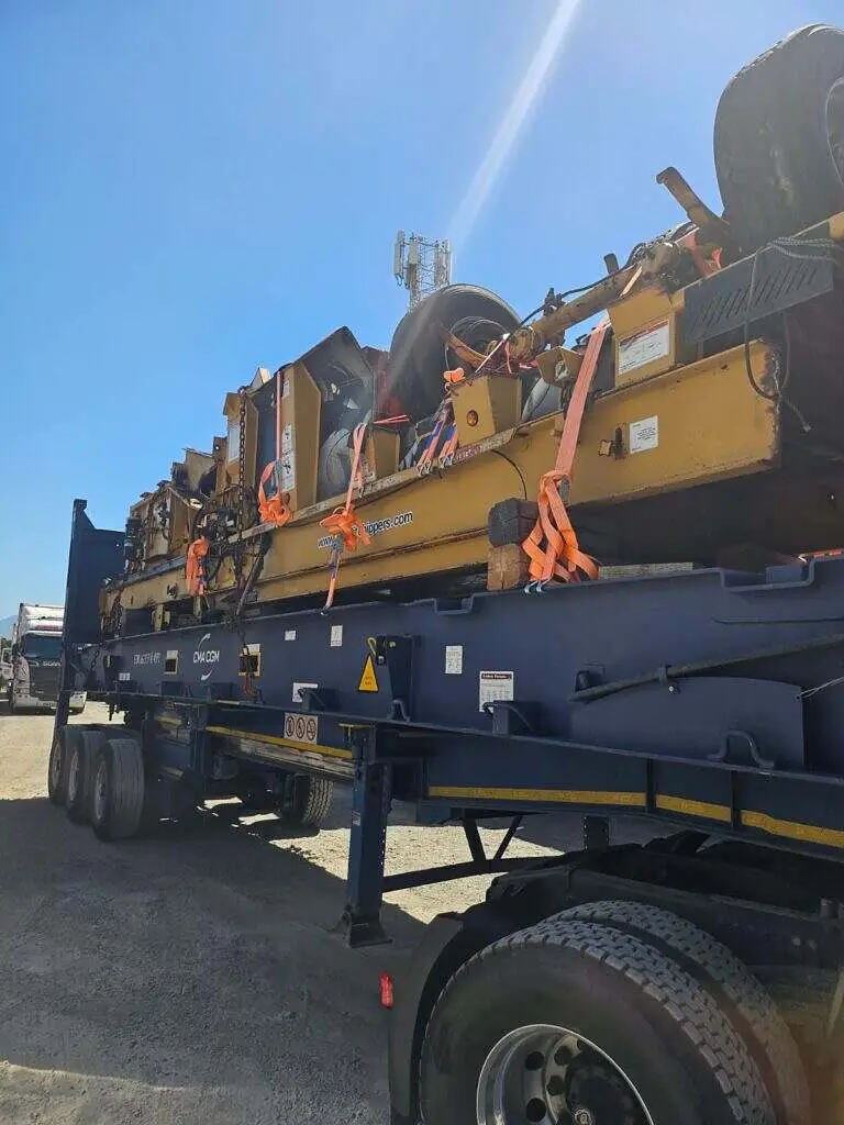 Following cleaning and preparation, the equipment was transported from its rural location to Piriou’s workshop near the Port of Réunion. The 14-meter-long, 3.5-meter-wide, and 4.2-meter-high machine was carefully dismantled to fit onto a flat rack and an open-top container. The chassis and three axles were secured to the flat rack, while the remaining components were loaded strategically into the container.