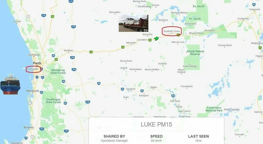 After arriving from South Africa and unloading at Fremantle, they were able to provide “Real Time” tracking to their customer of their important cargo to its destination outside the remote Western Australia town of Southern Cross.