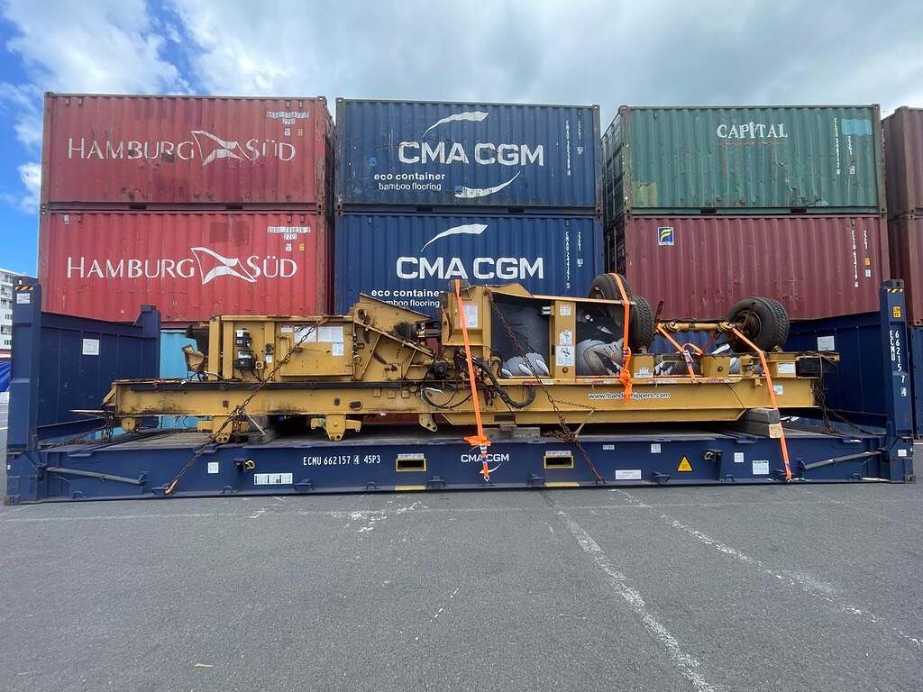 Following cleaning and preparation, the equipment was transported from its rural location to Piriou’s workshop near the Port of Réunion. The 14-meter-long, 3.5-meter-wide, and 4.2-meter-high machine was carefully dismantled to fit onto a flat rack and an open-top container. The chassis and three axles were secured to the flat rack, while the remaining components were loaded strategically into the container.